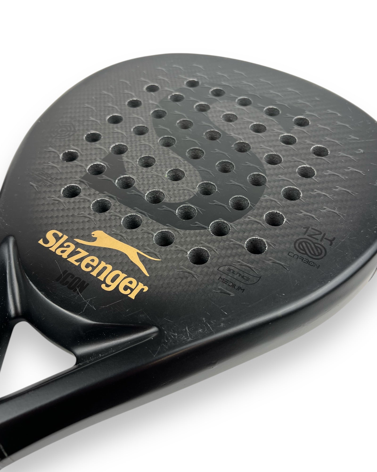 Slazenger Hybrid Icon är ett hybridformat racket som erbjuder både fart och kontroll, perfekt för allroundspelaren. Slagytan består av 12K Kolfiber som dessutom är synligt vilket ger racket en premiumkänsla. En yta i 12K kolfiber klassas som styv. En styv slagyta genererar mer fart på bollen. Ytan är dessutom applicerad med pantrar som skapar en struktur och därmed genererar spinn på bollen. Kärnan i racket är hård och består av 5 lager EVA Foam. Det yttre lagret har en högre densitet som verkar vid snabba bollar och ger dem högre kraft, medan det inre lagret som har en lägre densitet verkar vid långsammare bollar och förbättrar kontrollen. Detta tillsammans med den hårdare slagytan genererar mycket bra fart i slagen.